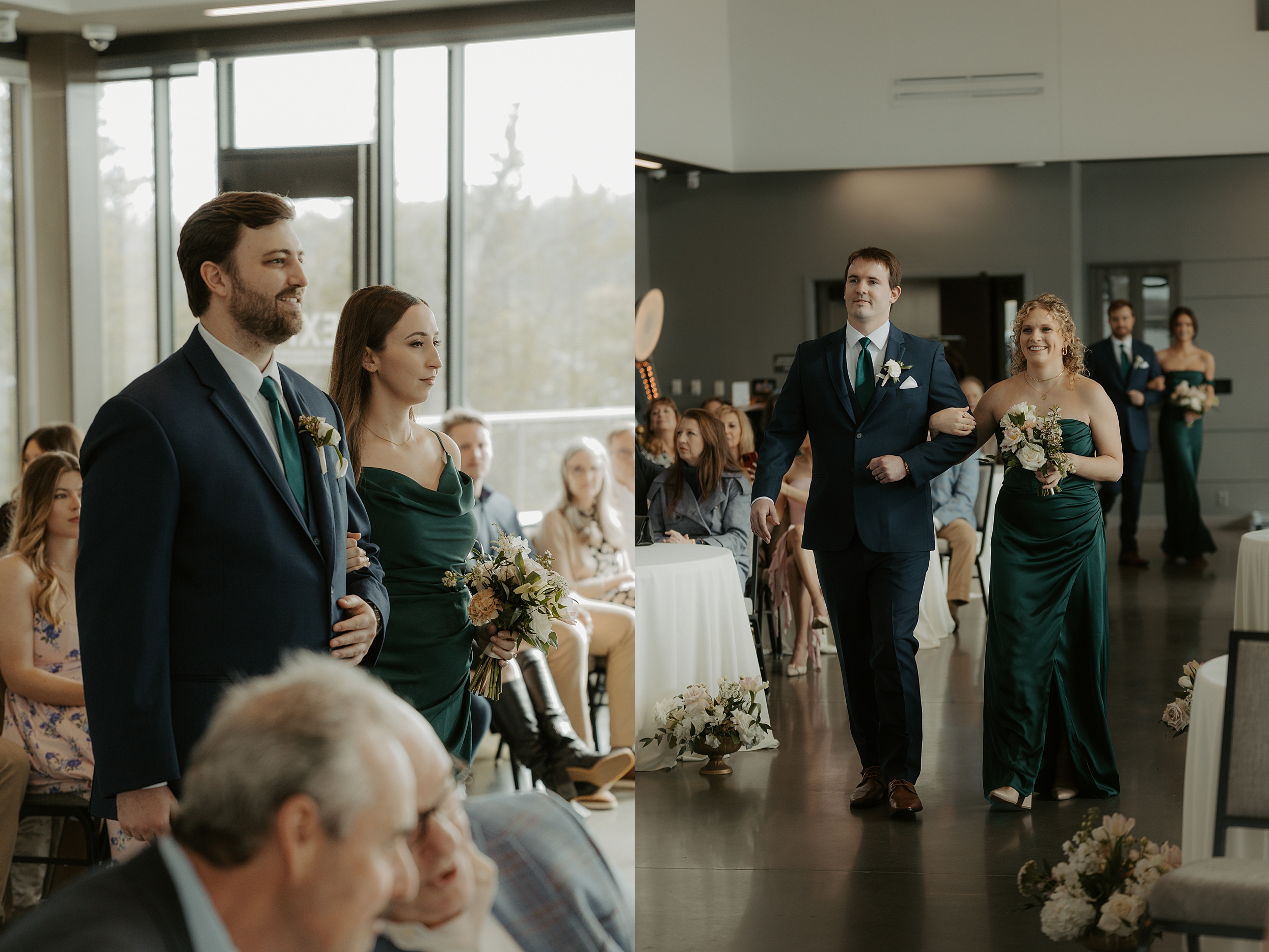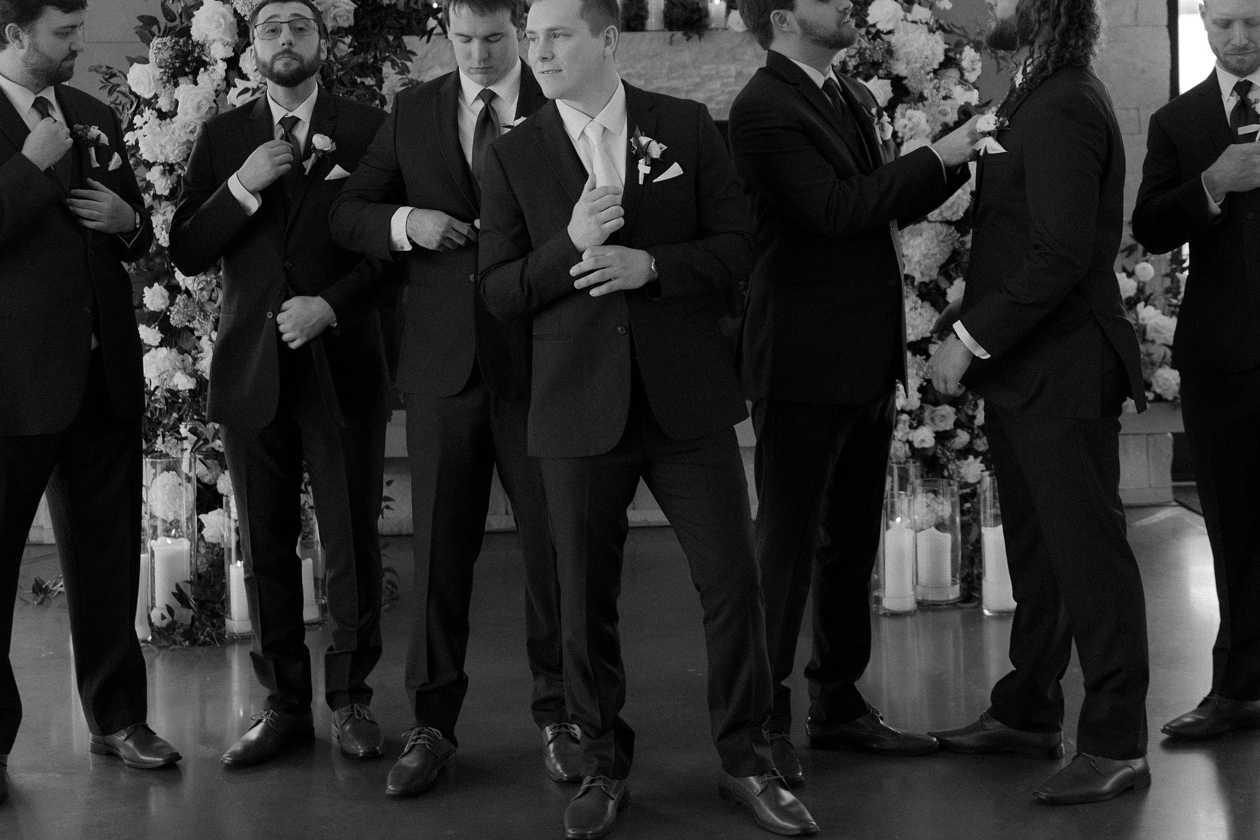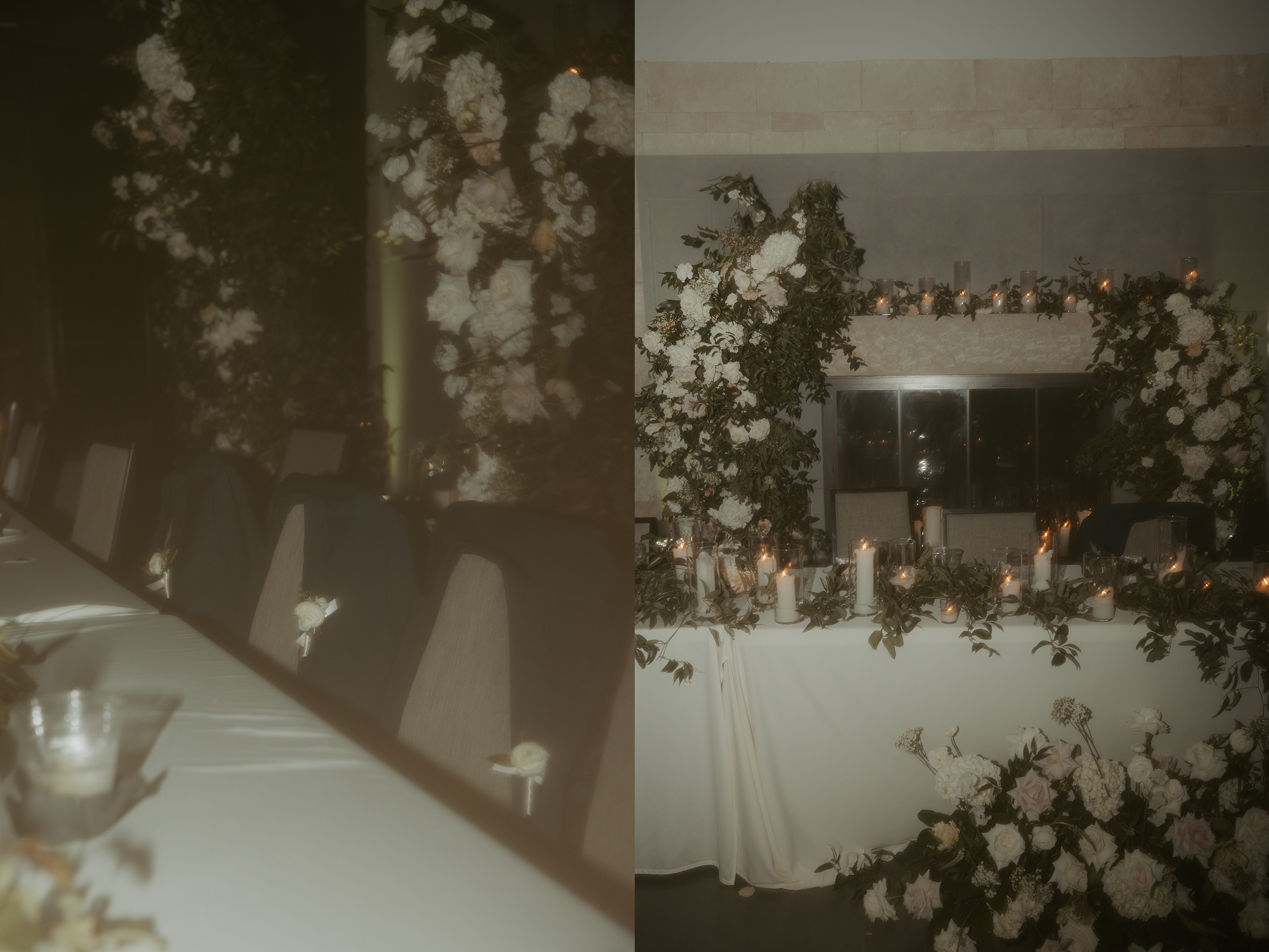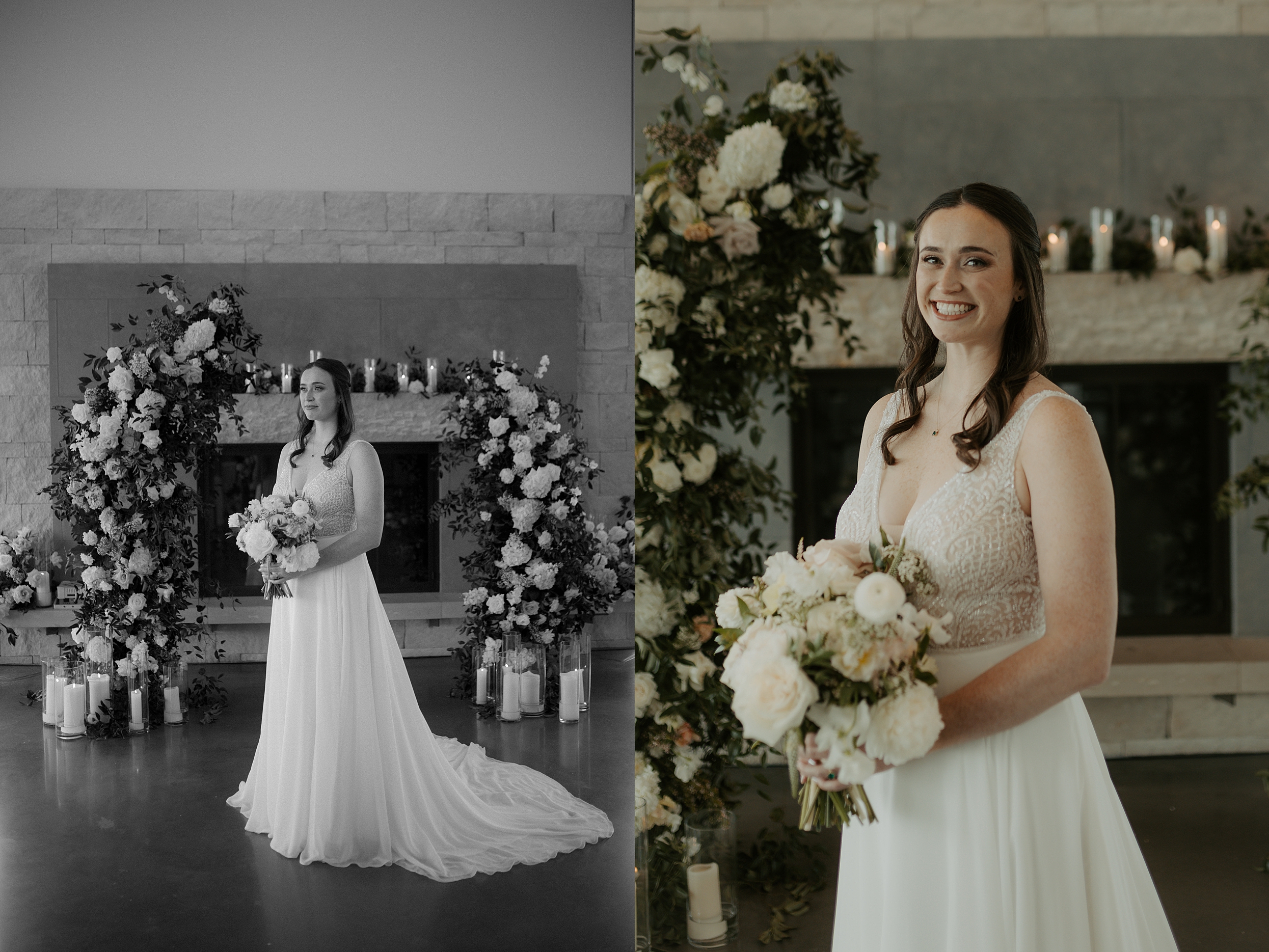 James and Keegan’s wedding day in Olathe, KS was nothing short of dreamy. They chose a modern, light-filled venue with soaring ceilings and a stunning fireplace as their backdrop. The space was transformed with an incredible floral installation – whites and greens framing the couple as they shared their vows. It felt intimate with candlelight adding that extra cozy glow against the clean, modern architecture. Their ceremony was full of tender, genuine moments; just the two of them, fully present, with big smiles. The simplicity of the space let their love shine, and the details – timeless florals, and soft lighting – made it absolutely unforgettable. This was one of those weddings that felt equal parts elegant and relaxed. The kind that makes you fall in love with documenting days like this all over again.