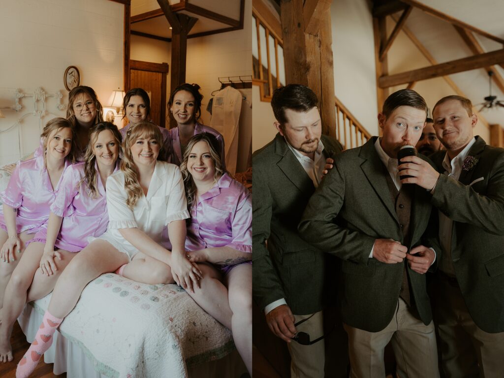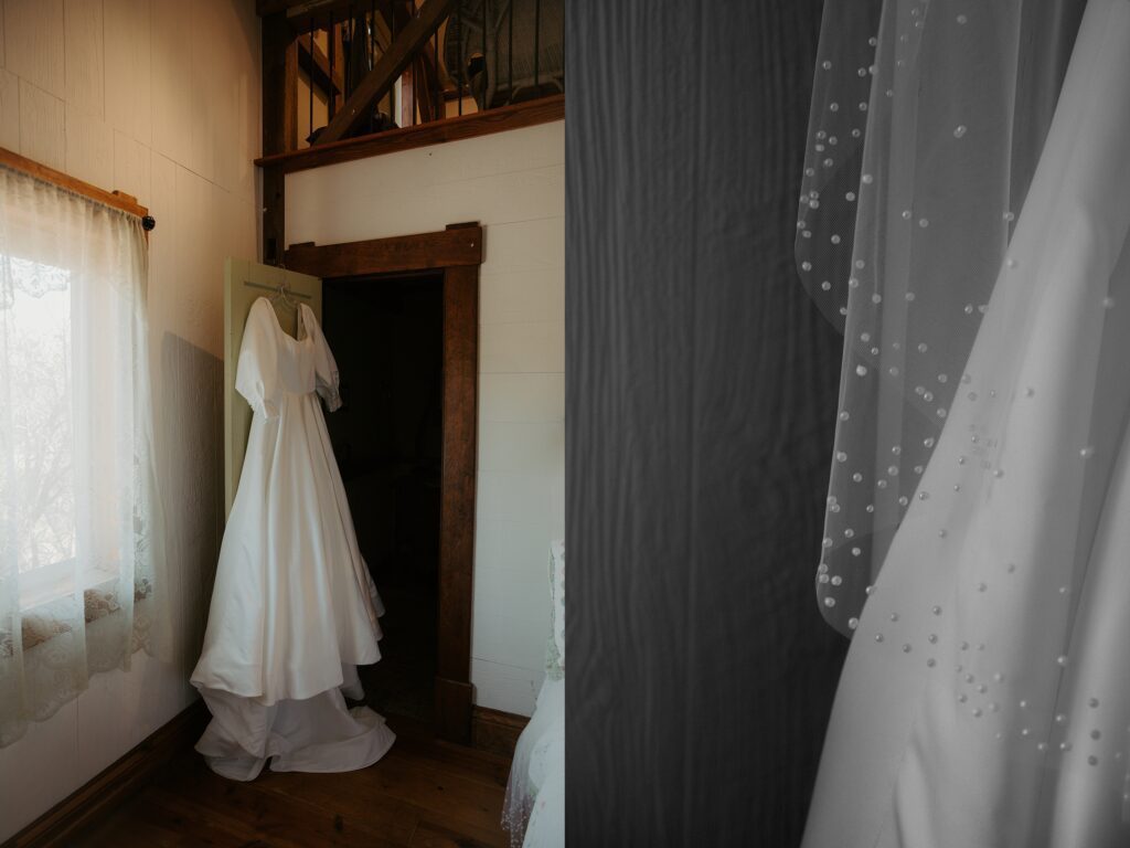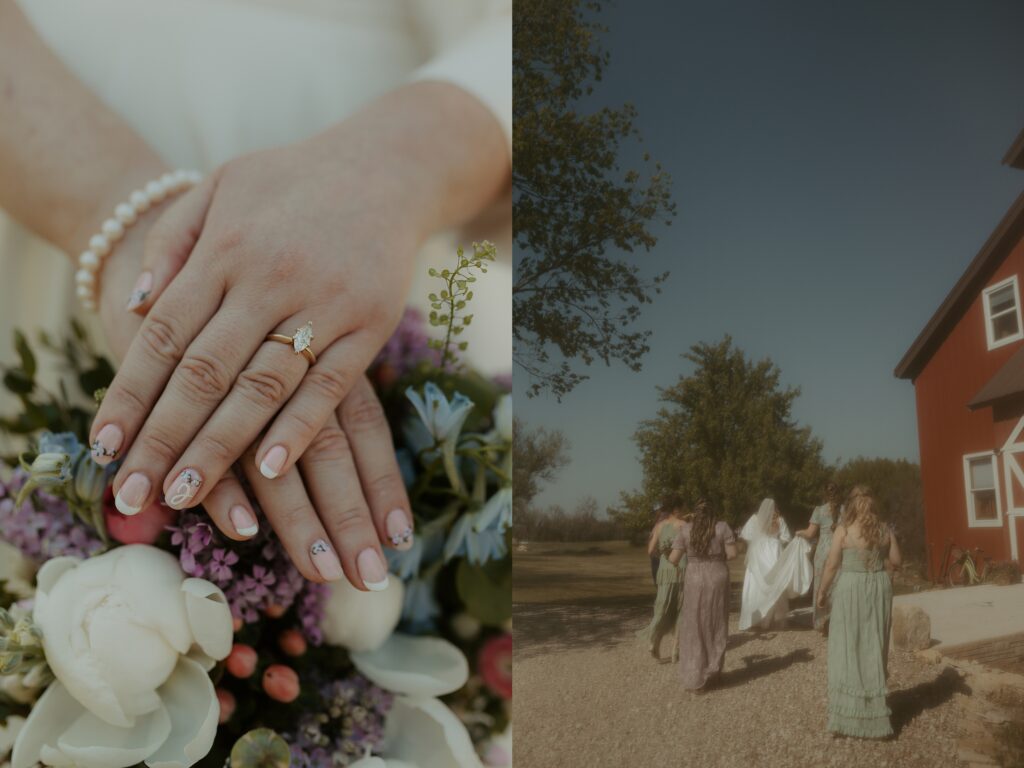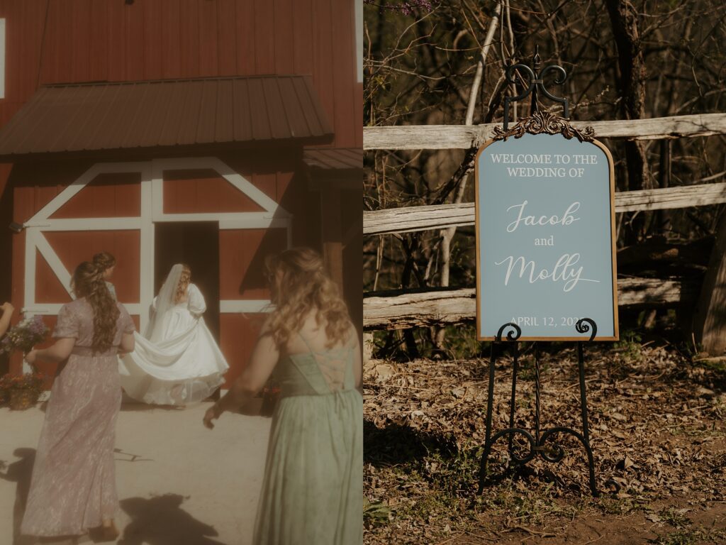 They tied the knot tucked back in the trees with the red barn peeking out behind them, and honestly, it couldn’t have been a more perfect backdrop. The sunlight streamed through the branches right as they said their vows, and it gave everything this golden, dreamy glow that made the whole ceremony feel extra magical.
